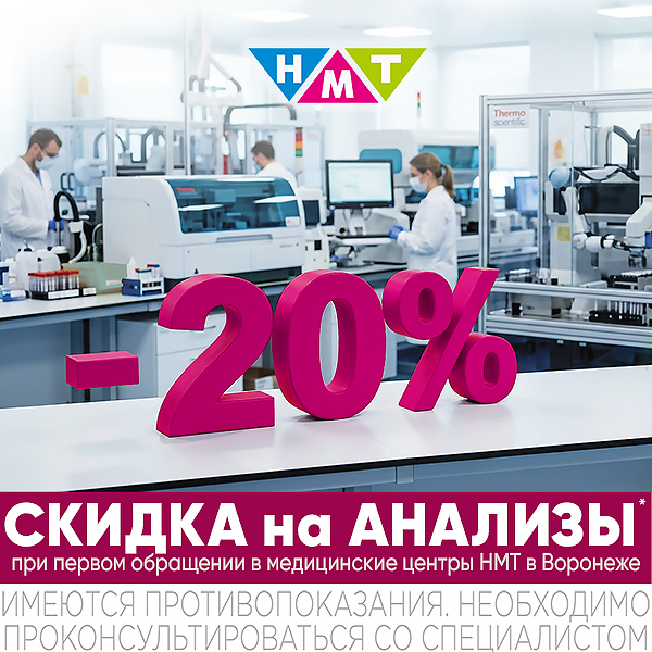***Организатор акции: ООО Компания «НМТ».Акция проводится с 01.05.2026 по 31.05.2026 во всех медицинских центрах НМТ в Воронеже.Скидка 20% на анализы предоставляется пациентам, которые до 01.05.2026 не были зарегистрированы в информационной системе медицинских центров НМТ в Воронеже и подтвердили согласие на участие в Бонусной программе НМТ. Скидка 20% предоставляется однократно при первом посещении медицинского центра НМТ в Воронеже, не действует при повторных посещениях. Скидка распространяется только на лабораторные исследования НМТ. При предоставлении скидки 20% в период акции дисконтные карты дополнительно не действуют, скидки не суммируются.Скидка 20% не распространяется на следующие лабораторные исследования: Аллоиммунные антитела (включая антитела к Rh-антигену); Хромогранин А, мкг/л, кровь; Респираторно-синцитиальный вирус (RSA), ИХА-скрининг, мазок, аспират; Лептин, кровь, нг/мл; Ингибин В, кровь, пг/мл; Антимюллеров гормон (MIS/AMH), кровь, нг/мл; АТ к Treponema pallidum суммарные (Snibe), кровь; ANA-профиль, кровь; Типирование HLA II класса локус DQA1 / DQB1 / DRB1; Кальпротектин (количественно), кал, мкг/г; Пищевая IgG аллергия, 90 аллергенов (Российская панель); Иммунный статус расширенный; 17-кетостероиды, моча, мг/сут.